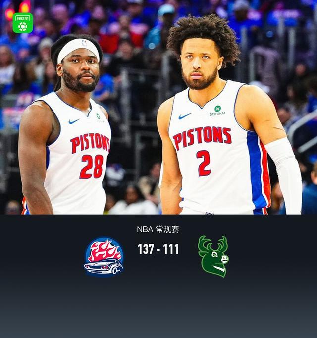 第四节活塞杰伦-杜伦拿下10分,雄鹿科马克-瑞安拿下8分,最终活塞137-111战胜雄鹿